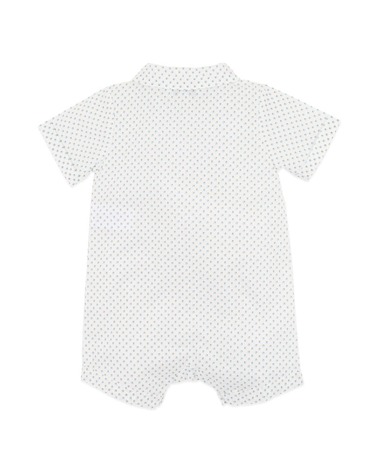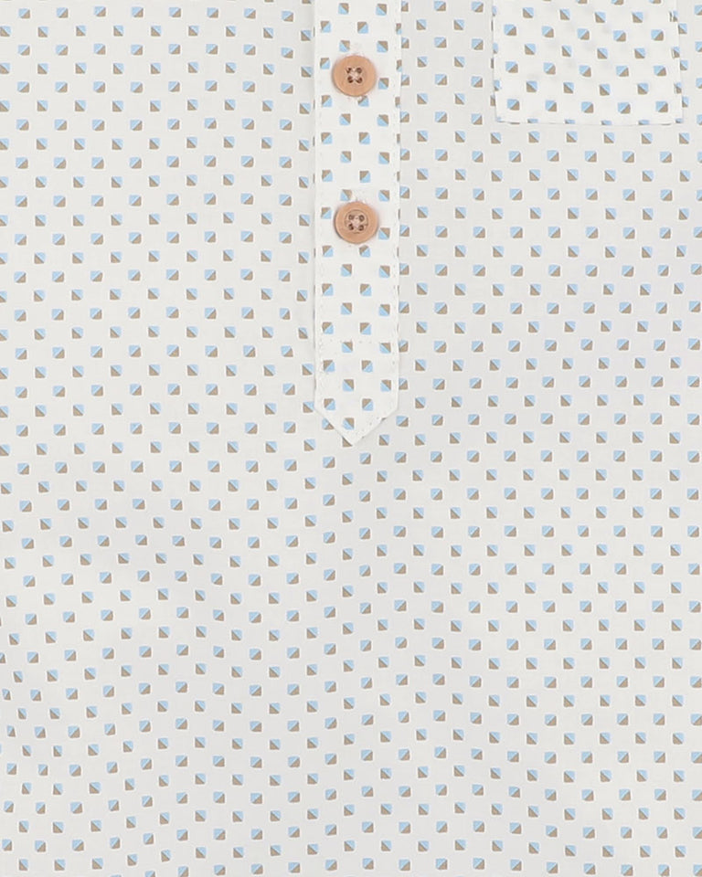 Smart yet playful, this charming romper is made for warm days and special moments. Crafted from soft, breathable cotton, it features an all-over geo print and classic shirt collar for a polished finish. Wooden-look buttons and a chest pocket add timeless detail, while press studs at the crotch make changing quick and easy.