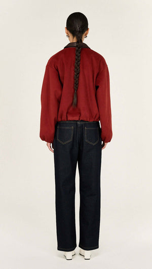 A modern outerwear statement, the Meava Burgundy Brushed Bomber Jacket blends tactility with a refined silhouette. Designed in a plush, softly brushed fabrication, it features a structured contrast vegan leather collar, snap-button front and subtly voluminous sleeves that taper at the cuff. Cropped through the body for contemporary proportion, it layers effortlessly over everyday looks while adding rich depth and warmth.
