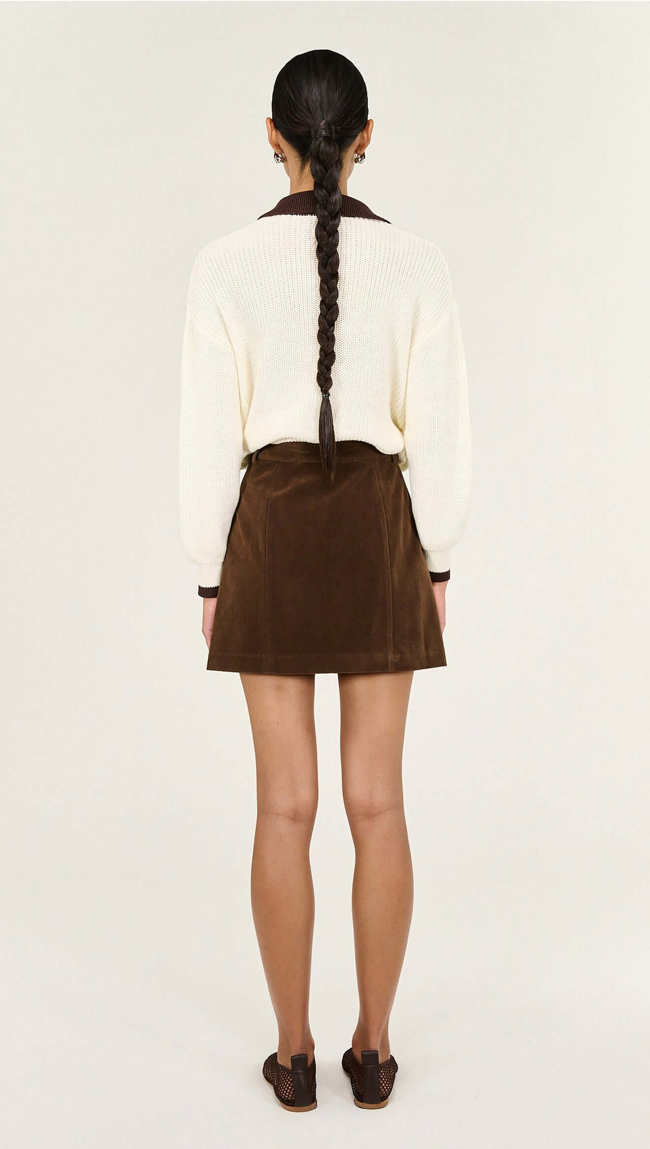 A modern take on a collegiate knit, the Daria Chocolate Contrast Polo Knit Jumper balances relaxed ease with refined detailing. Crafted in a soft, textured knit, it features a contrast chocolate collar and placket that frame a flattering V neckline. The gently slouched silhouette is finished with ribbed trims at the cuffs and hem, creating subtle shape while maintaining an effortless feel.