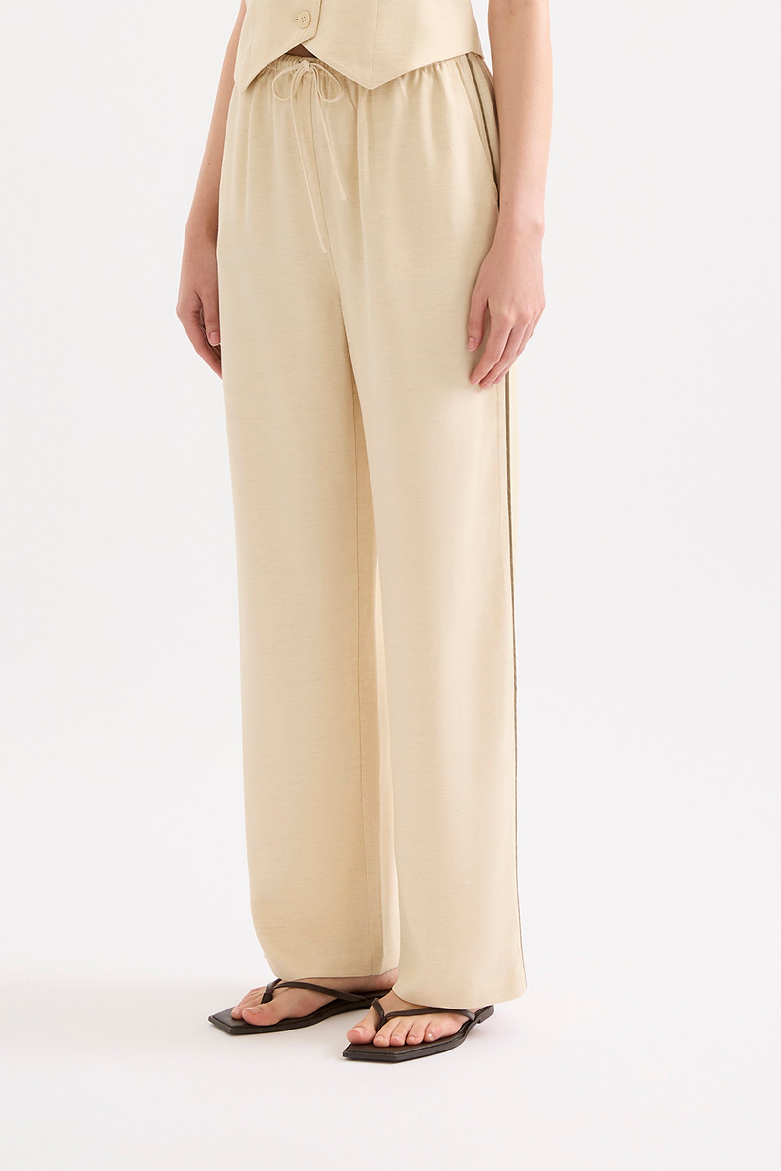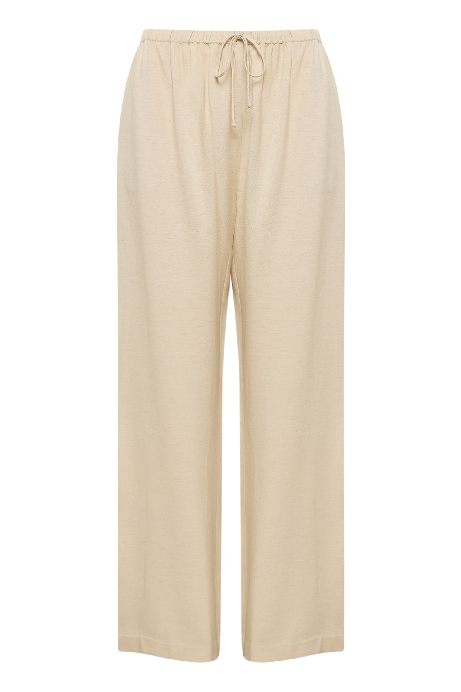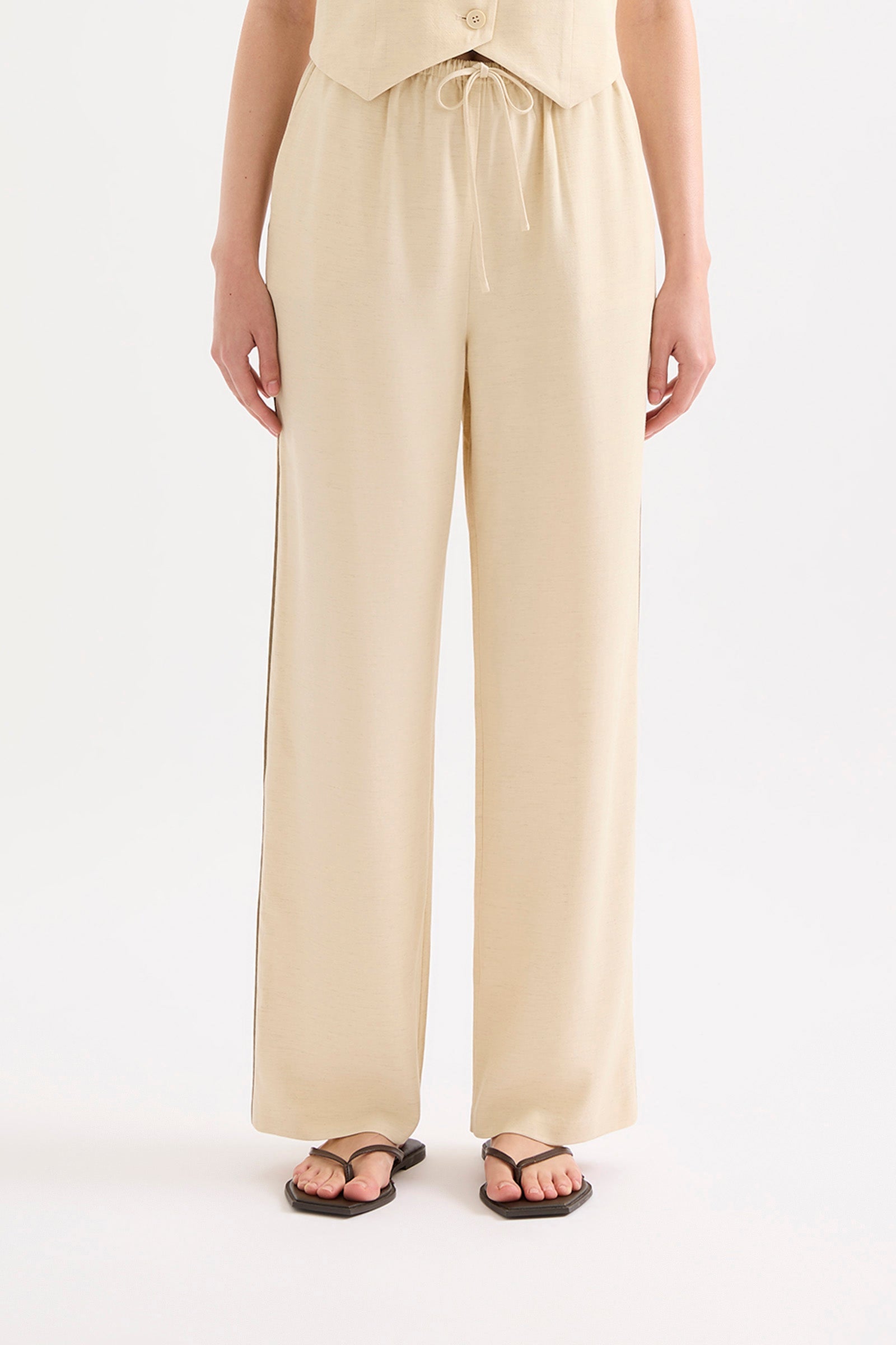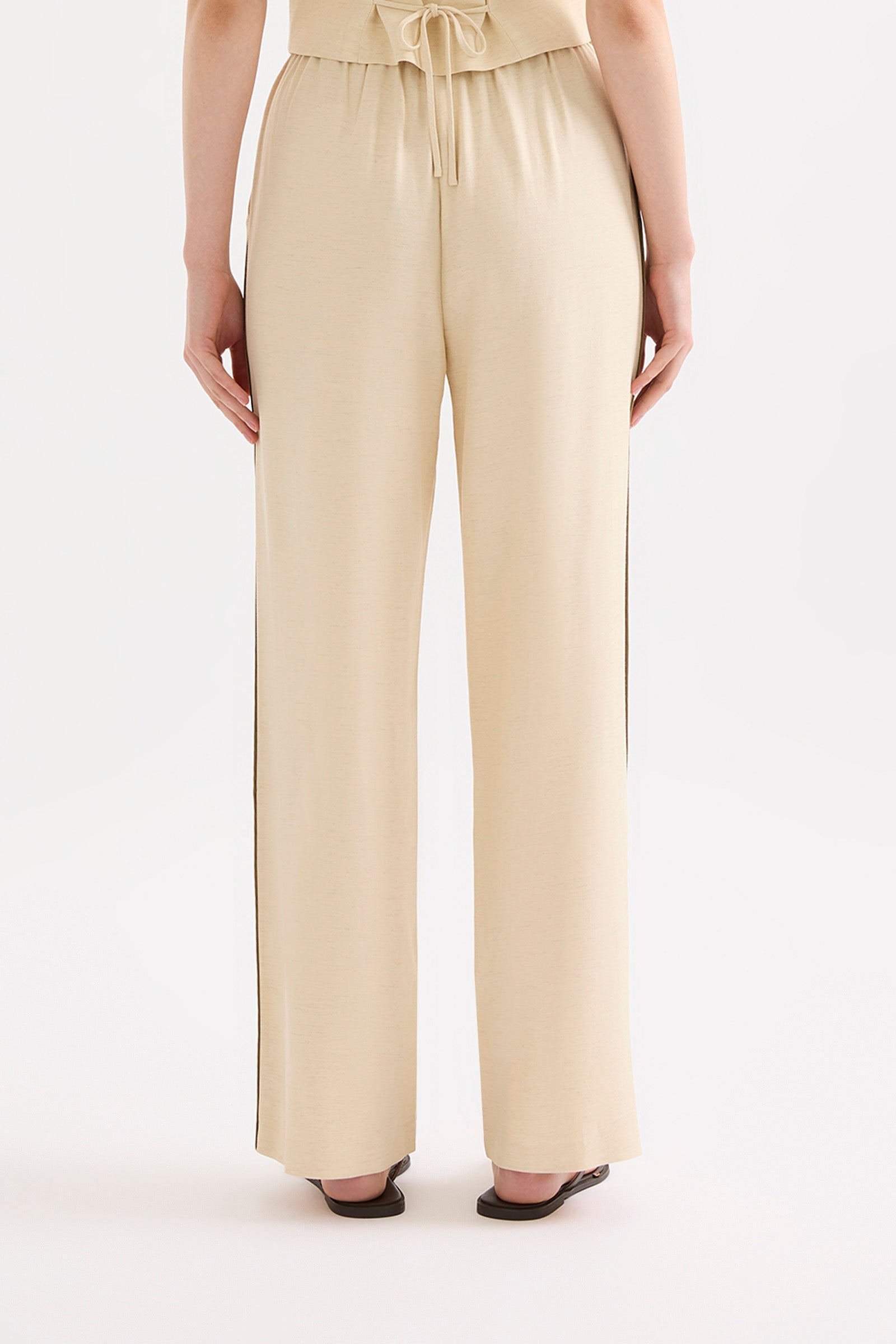 The Garcia Pant is made from a viscose blend fabrication which has a dry hand feel and a slub linen yarn throughout giving a light speckled appearance. The silhouette is relaxed with a wide full length leg. Features include an elasticated waistband with an external draw cord and contrast piping down side seams.