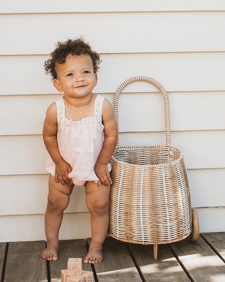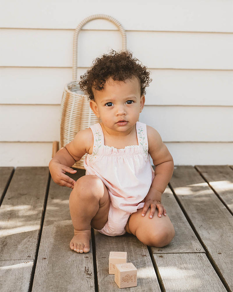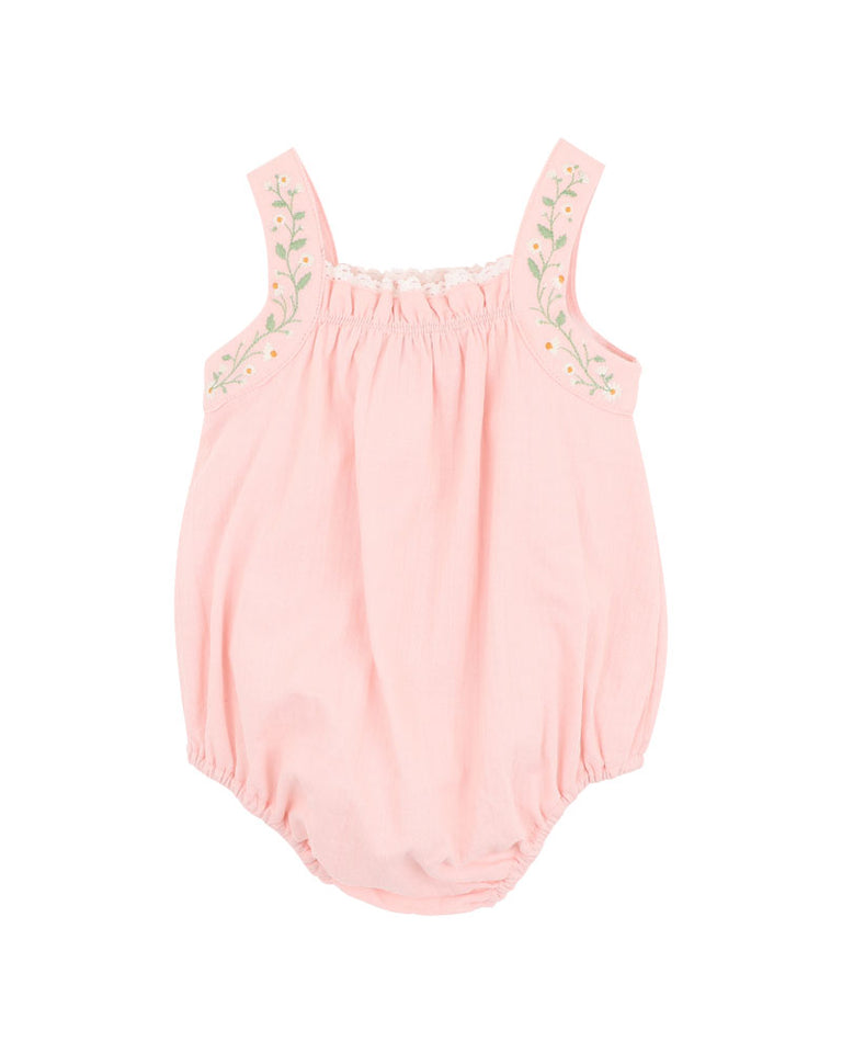 A charming summer piece made for sun-filled days, this sweet romper features delicate embroidery trailing up each shoulder strap, and a soft lace trim peeking from the neckline. Gentle elastic at the legs and back makes for a snug, comfy fit - perfect for play or special outings.